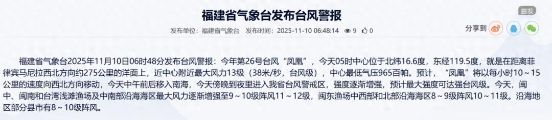 台风“凤凰”已于昨天(9日)在菲律宾吕宋岛奥罗拉省沿海登陆,预计再次登陆!将于10日傍晚到夜里进入福建省台风警戒区。